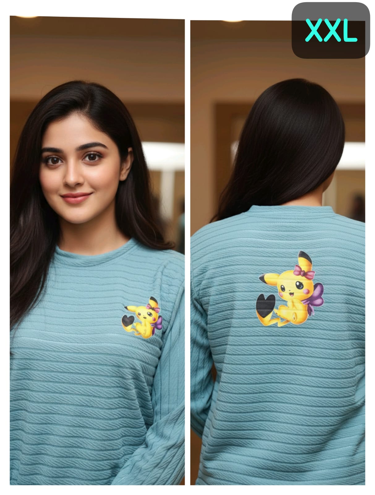 This women’s textured blue sweatshirt features a soft, stretchable fabric with a stylish ribbed pattern for a premium look and comfortable feel. The sweatshirt is highlighted with an adorable cartoon-style character print on both the front and back, adding a playful and trendy touch. Designed for everyday comfort, it offers a relaxed fit that is ideal for casual wear, lounging, or winter layering. Suitable for daily use, travel, or light outdoor activities.